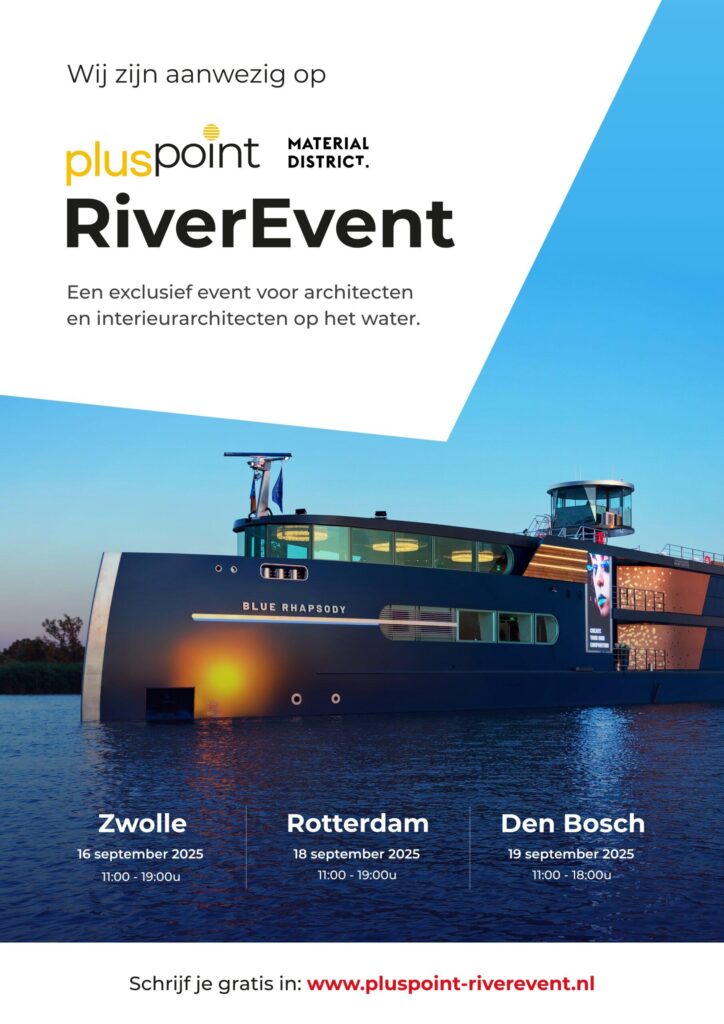 Wij zijn trots om aan te kondigen dat wij binnenkort aanwezig zijn als exposant (stand 244) op PlusPoint River Event – Nederlandse editie. Dit inspirerende evenement in samenwerking met onder andere Material District brengt architecten, interieurontwerpers, projectontwikkelaars en beslissingsmakers samen om de nieuwste trends en innovaties in de bouw- en interieurwereld te ontdekken.